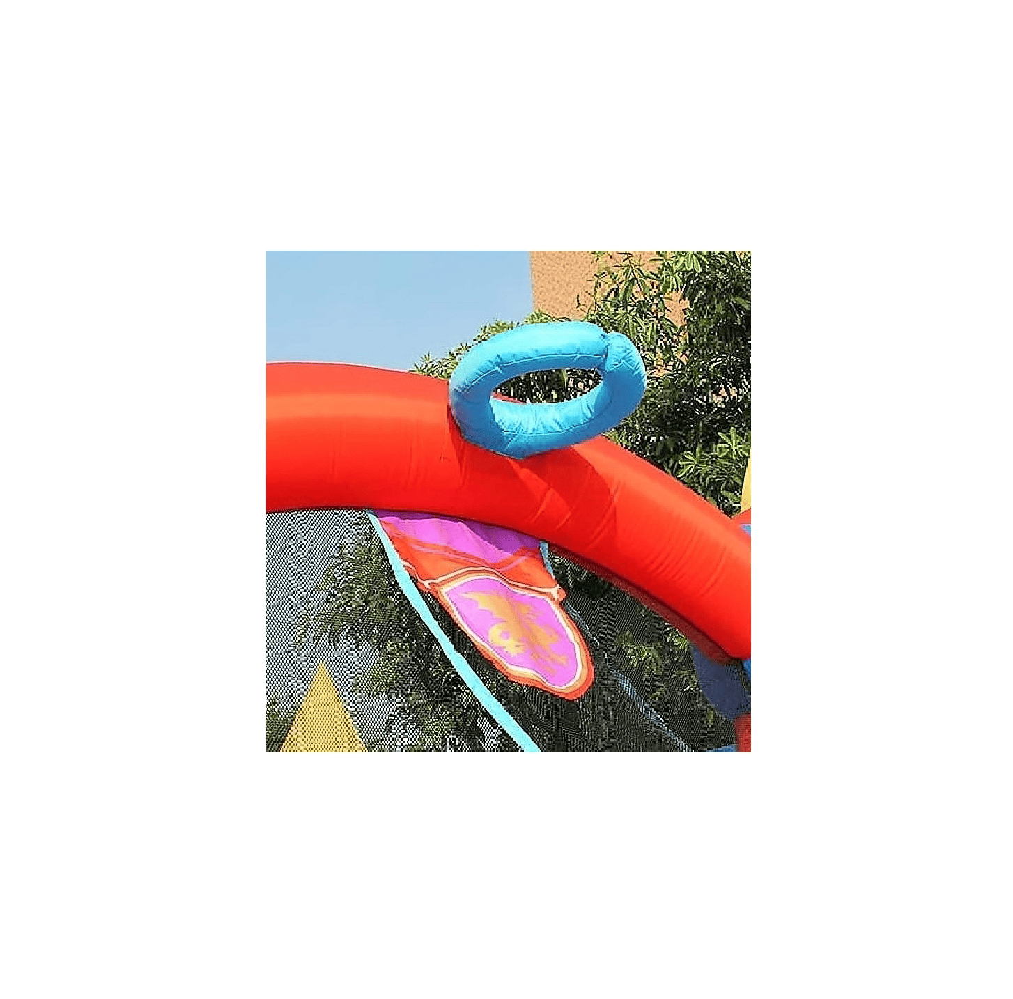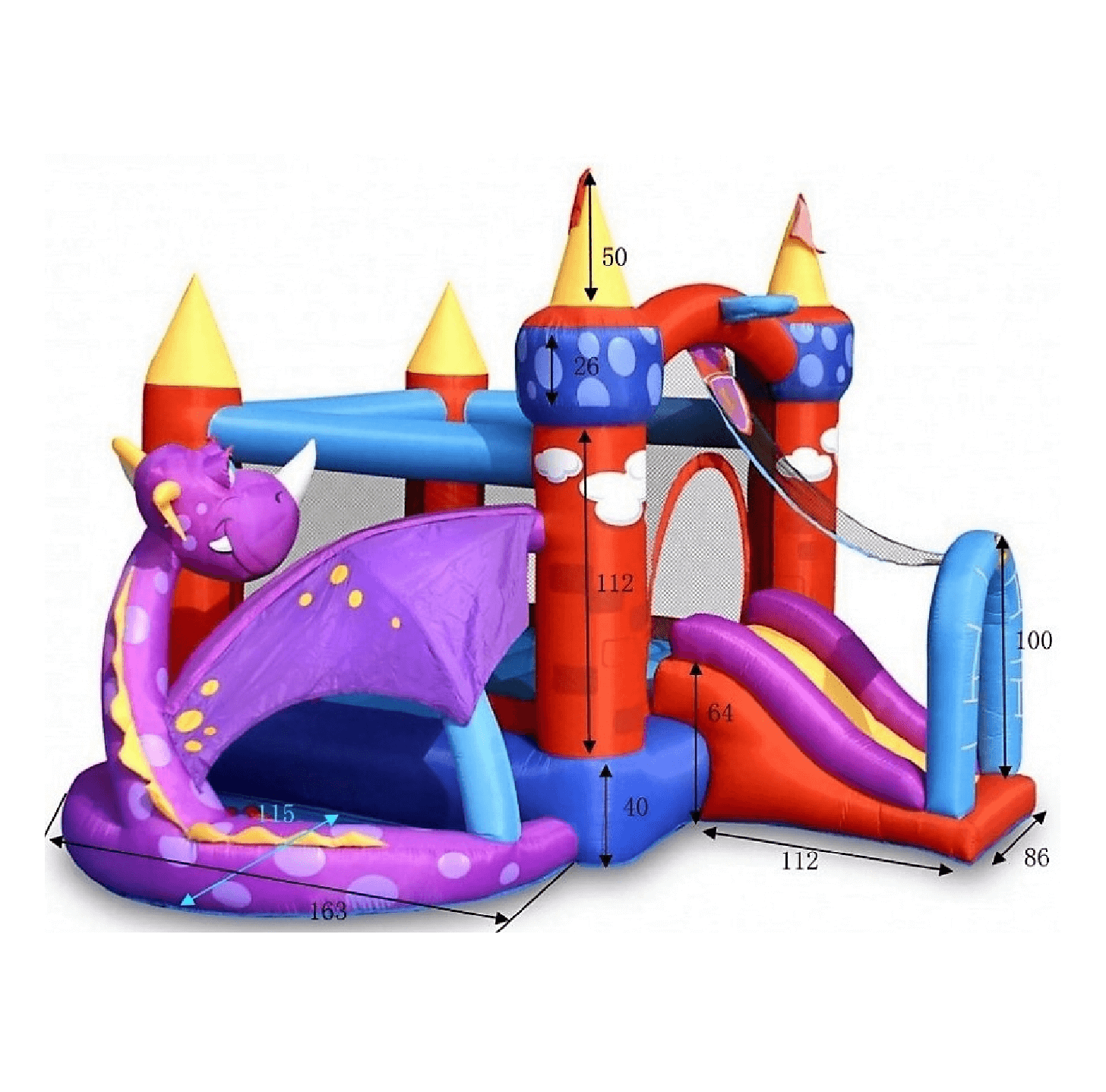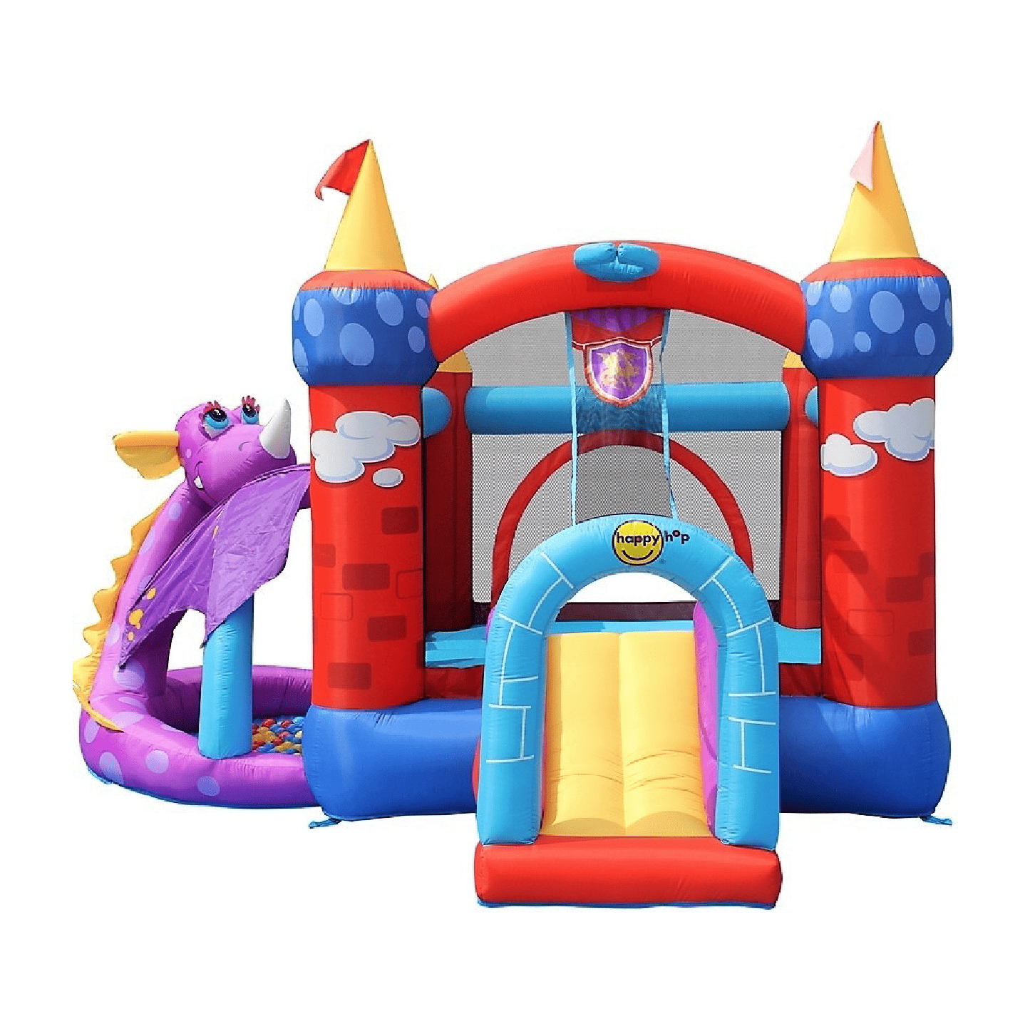 Parádny dračí skákací hrad je multifunkčnou atrakciou, ktorá spája hneď viacero obľúbených detských zábavok na jednom mieste. Ponúka priestor na hranie s loptičkami pre najmenšie deti so slnečnou clonou, ale tiež aj priestor na skákanie, šmýkanie, basketbalový kôš, či "roh" na hádzanie kruhov.