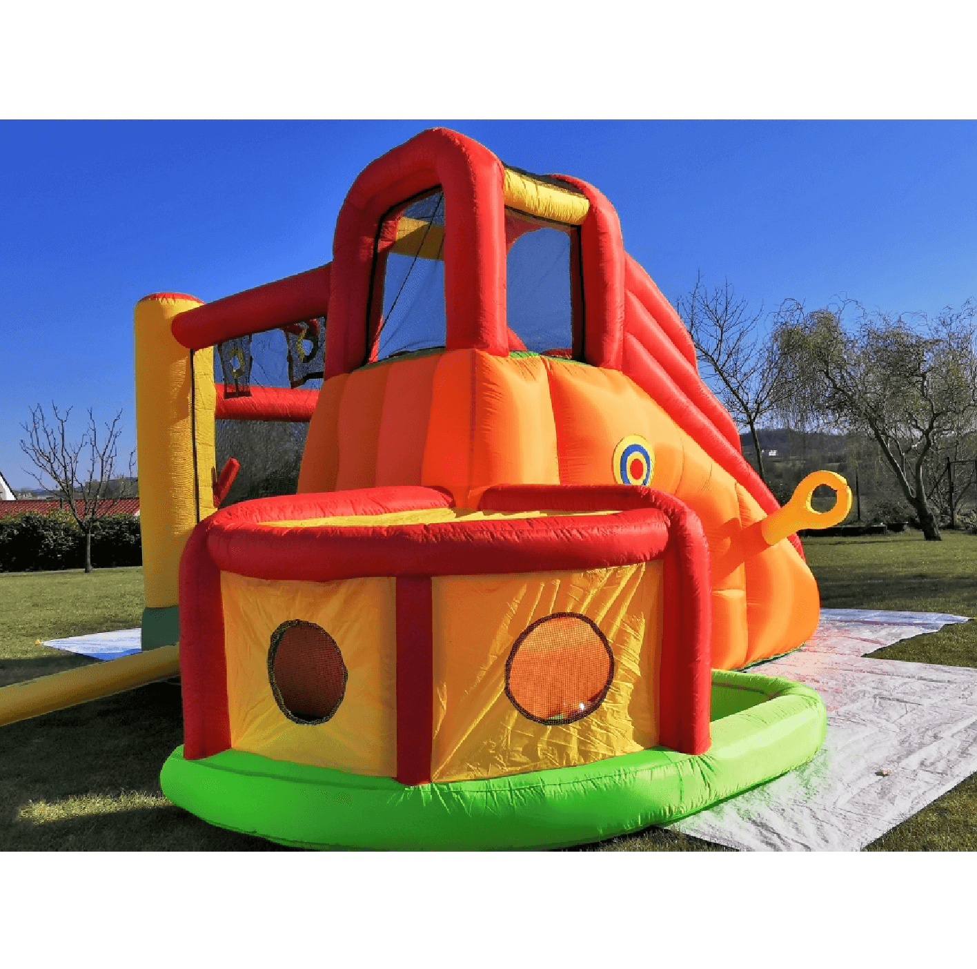 Nafukovacie hracie centrum, ktoré spája zábavu a rozvoj športových zručností. Play centrum 11 v 1 ponúka nielen skákanie a šmýkanie sa po šmykľavke, ale aj ďalšie možnosti. Deti môžu preliezať dva rôzne tunely, hádzať loptičky na terče alebo do basketbalového koša. Menšie deti sa zabavia v bazéniku s hracími loptičkami.