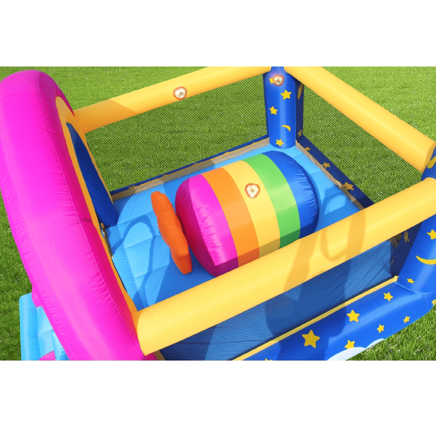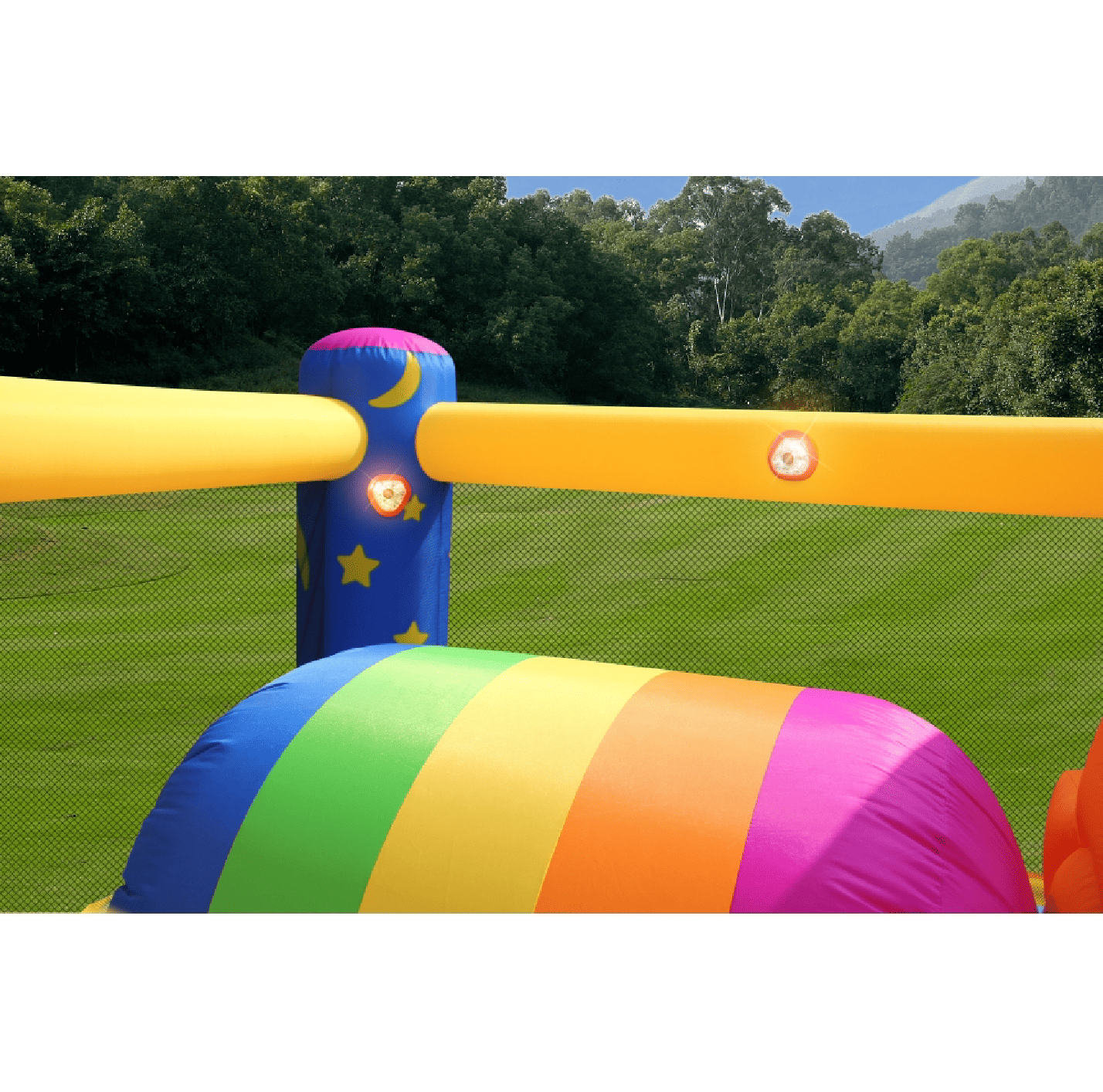 Obsahuje aj šesť tlačidiel pre hudbu a svetlá. Deti si užijú skákanie, hrací priestor, šmykľavku, hudbu a svetlá súčasne. Všetko, čo milujú - na jednom mieste. Tlačidlá reagujú na stlačenie rukou. Krátko hrajú a svietia.