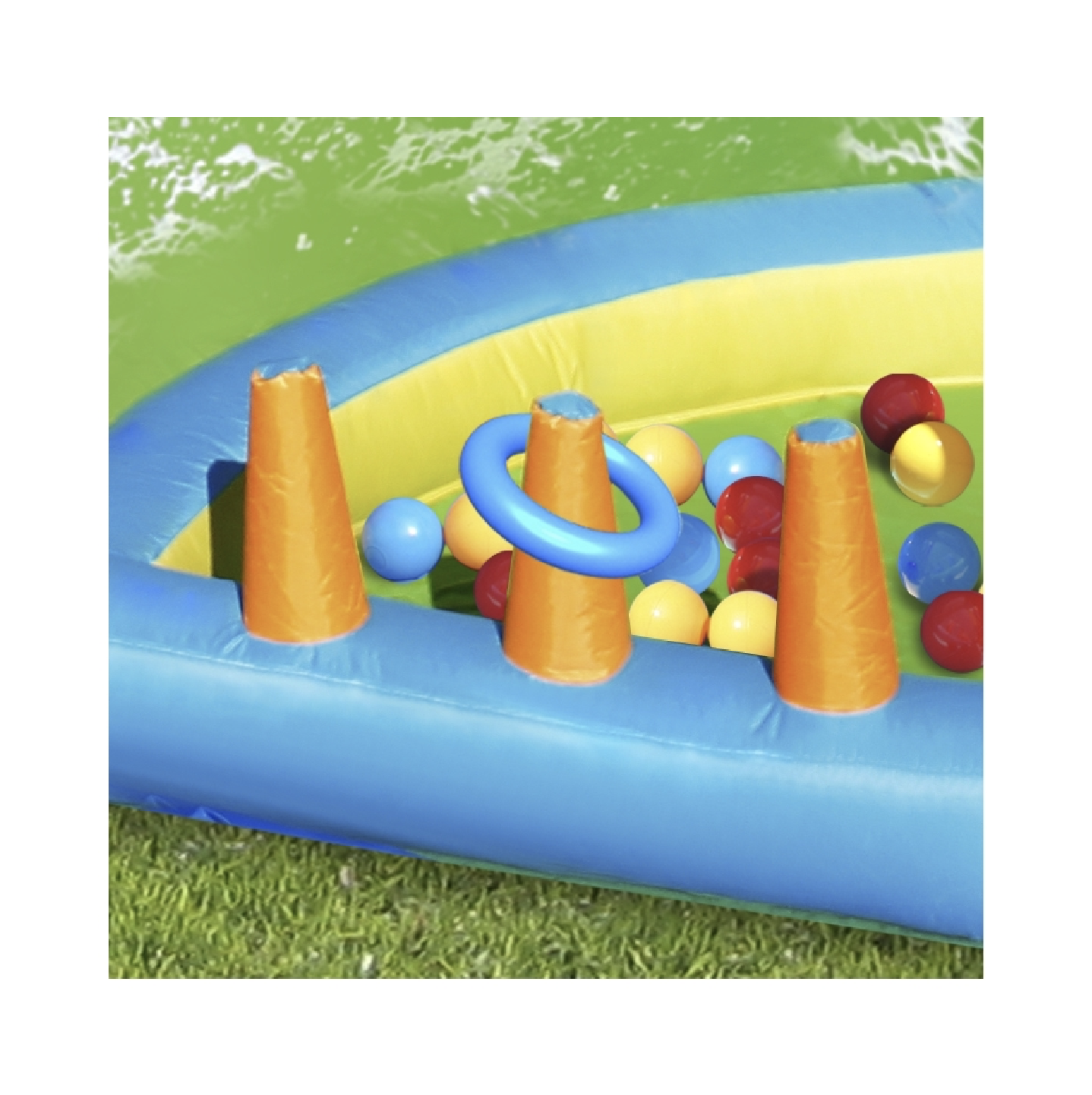 Skákanie, vodná šmykľavka, vodné delo a hracia plocha s loptičkami – to všetko spolu v tejto skvelej atrakcii.